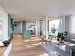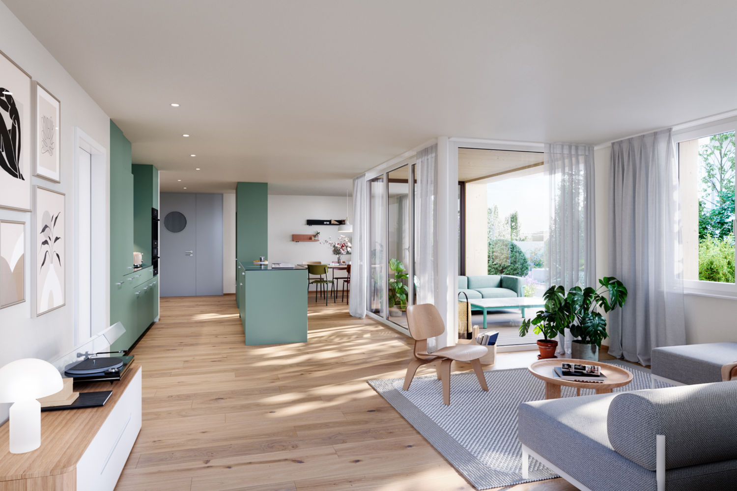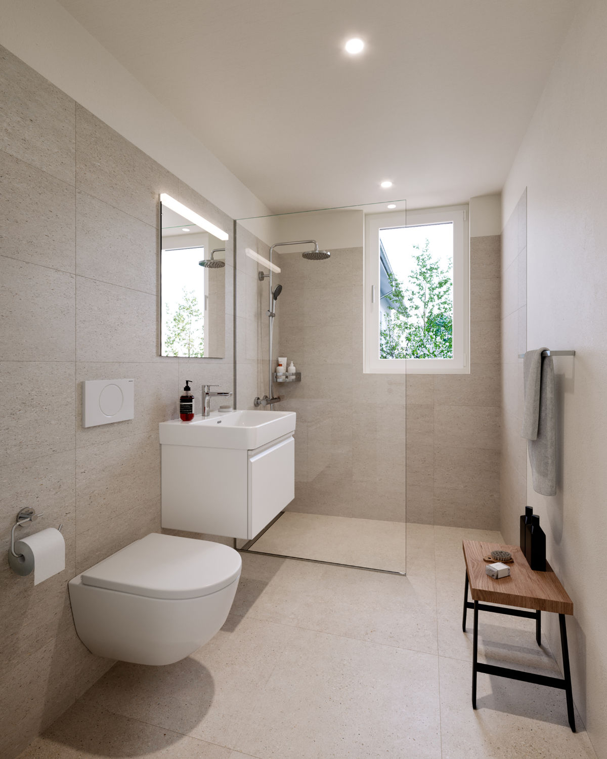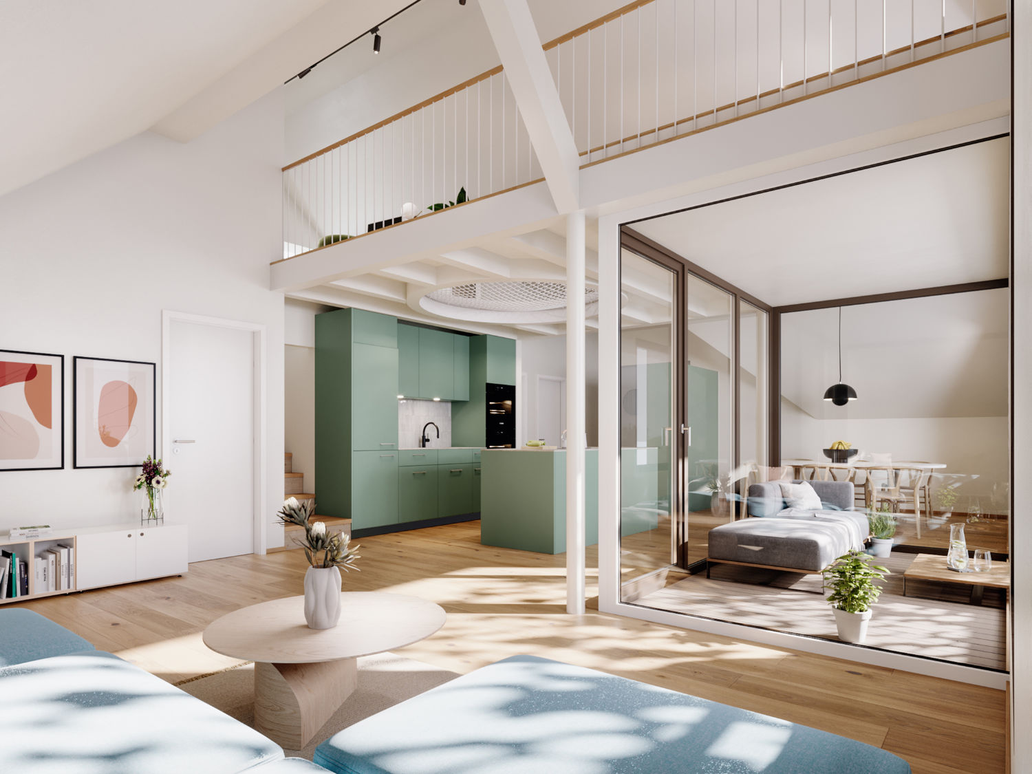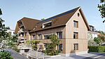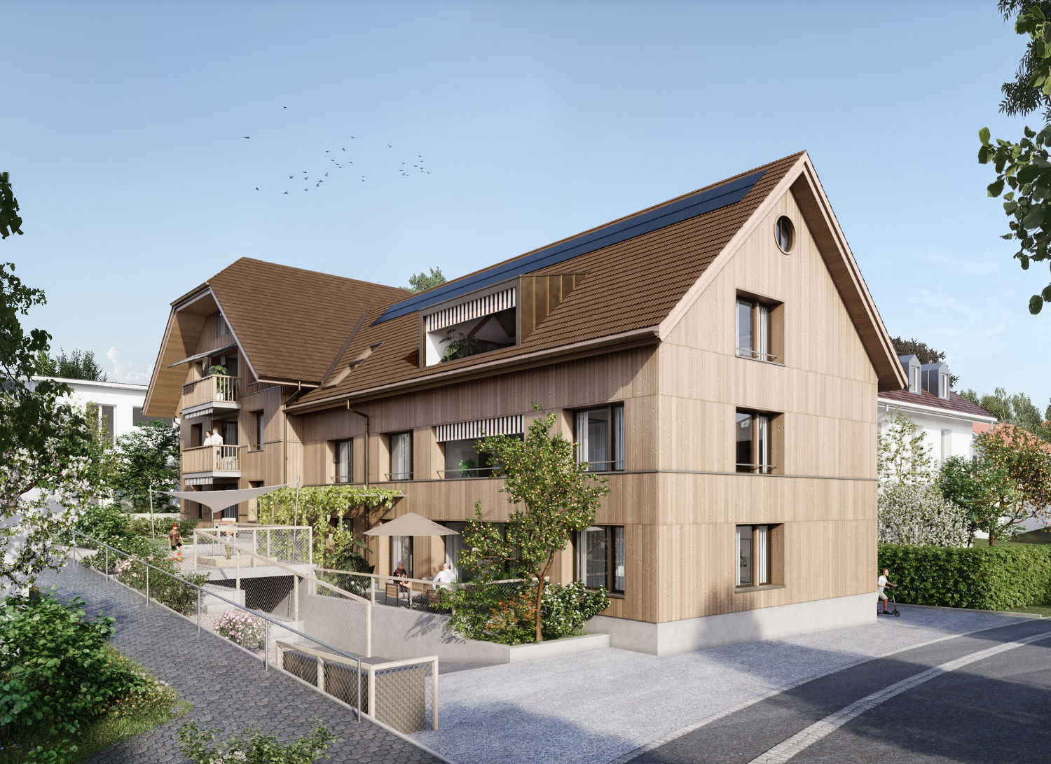 Das Projekt umfasst 6 Wohnungen im Stockwerkeigentum. Im Inneren überzeugen grosszügige Räume und lichte Wohnbereiche mit spannenden Bezügen zwischen Küche, Ess- und Wohnraum. Der überdachte Sitzplatz erweitert den Wohnraum ins Freie und schützt vor Sonne und Witterung. Dank der südseitigen Öffnungen und der Galerie im Dachgeschoss entsteht eine helle, offene Atmosphäre. Das Treppenhaus an der Südseite trennt Fussgänger vom Fahrzeugverkehr und sorgt für Sicherheit sowie klare Wegeführung. Eine sorgfältige Freiraumgestaltung verbindet Privatsphäre und Begegnung harmonisch.