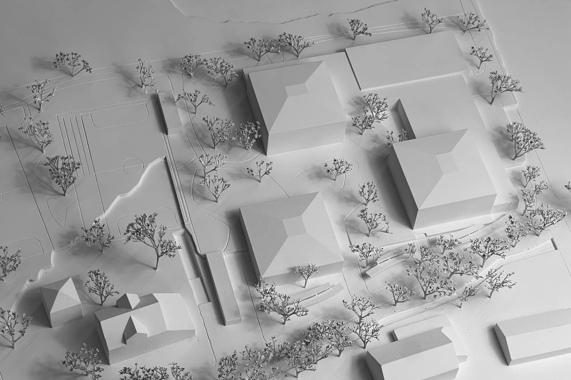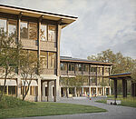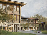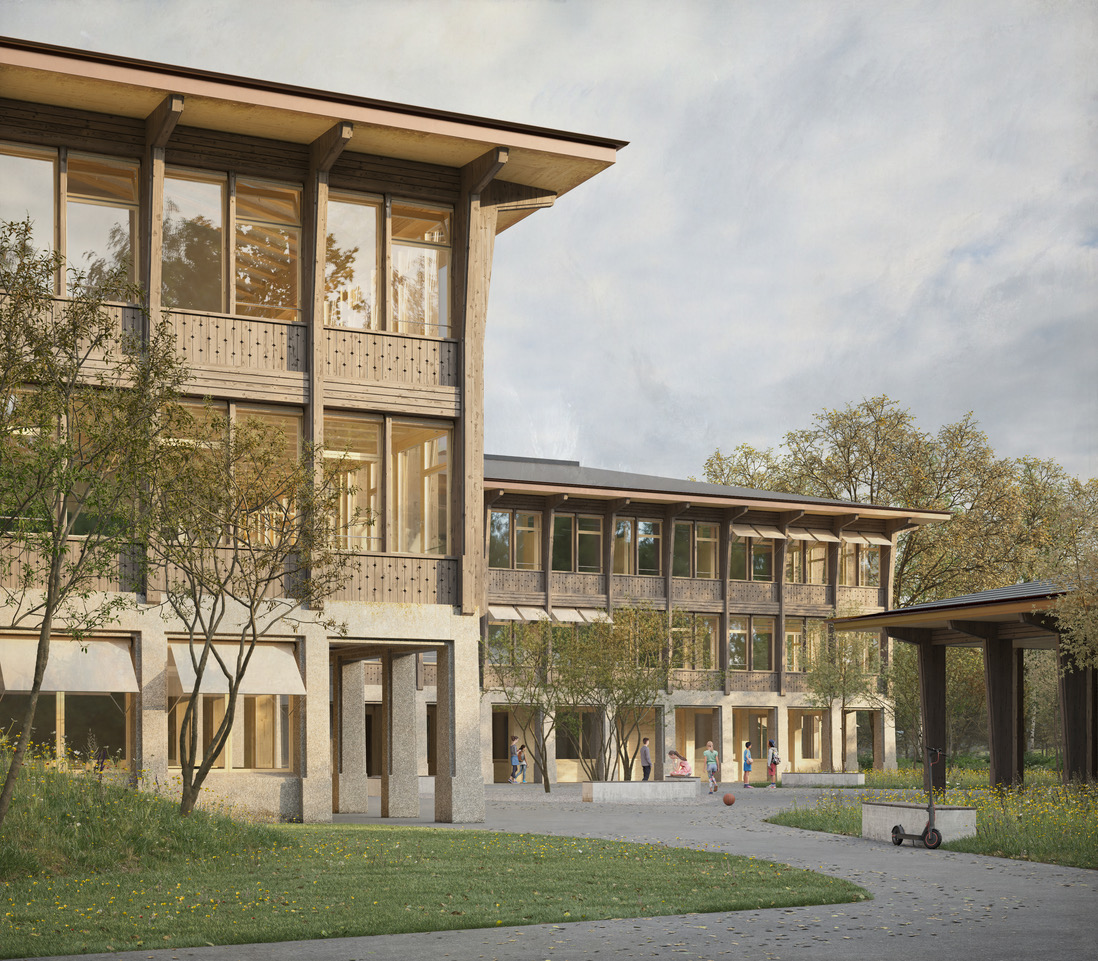 Das Projekt „Dreiklang“ setzt diese Anforderungen in ein präzises Zusammenspiel von Bestand, Neubau und Landschaft um. Der Entwurf stärkt die Identität der Anlage, indem er die Qualitäten des Bestands weiterführt und durch kompakte Ergänzungen klug ergänzt. Neue Holzaufstockungen schaffen helle, ökologisch hochwertige Lernräume; die Freiraumgestaltung nimmt Topografie und Baumbestand auf und formt ein zusammenhängendes Parkband mit klaren Spiel-, Lern- und Bewegungszonen.