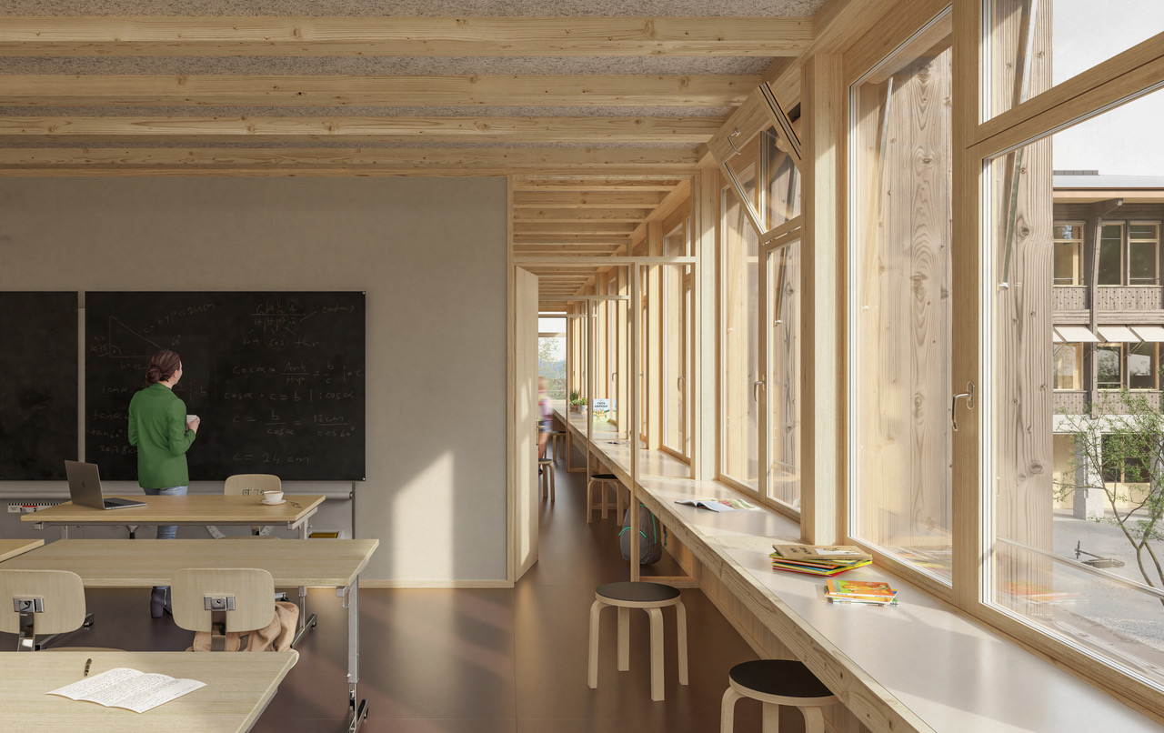Die Schulanlage Kandermatte, 1975 vom Berner Architekten Werner Küenzi entworfen, zeichnet sich durch eine hohe räumliche und gestalterische Qualität aus. Für ihre Zukunft plante die Gemeinde Thierachern eine umfassende Sanierung und Erweiterung, um ein flexibel nutzbares Mehrlehrgangsmodell mit projektorientierten und halbklassenbasierten Unterrichtsformen zu ermöglichen. Das rund 50-jährige Ensemble sollte funktional erneuert, pädagogisch weiterentwickelt und zugleich behutsam in die gewachsene Umgebung eingebettet werden – mit zusätzlichen Unterrichtsräumen, zeitgemässer Infrastruktur und einer nachhaltigen Bauweise.