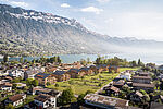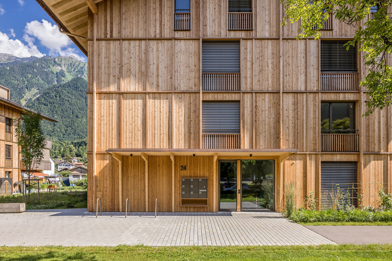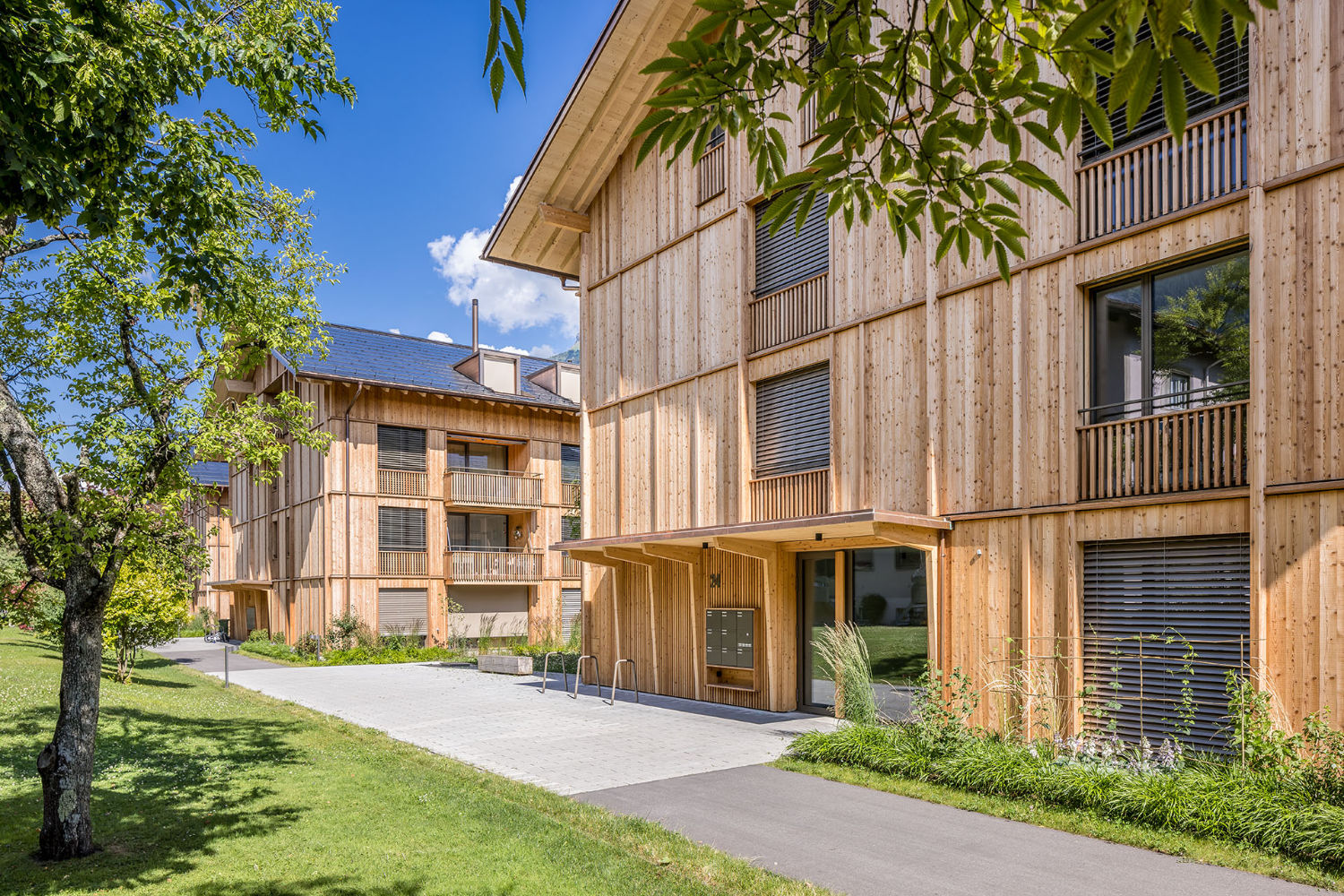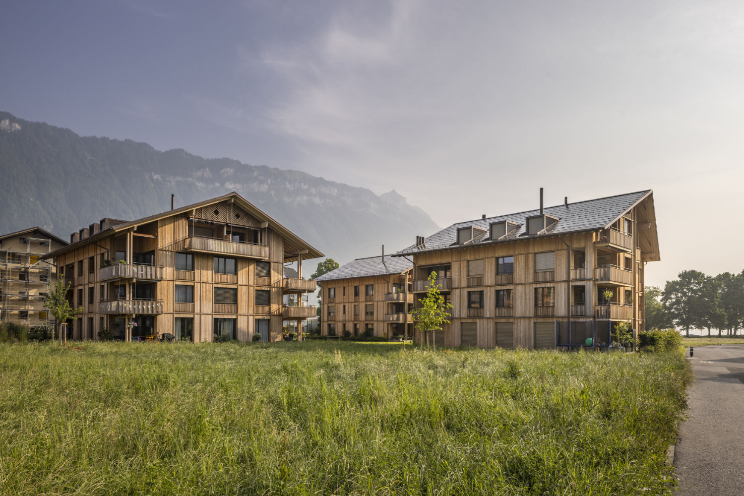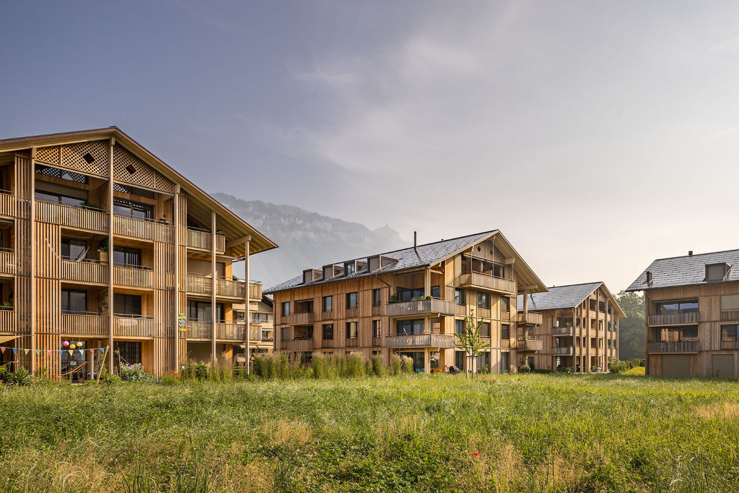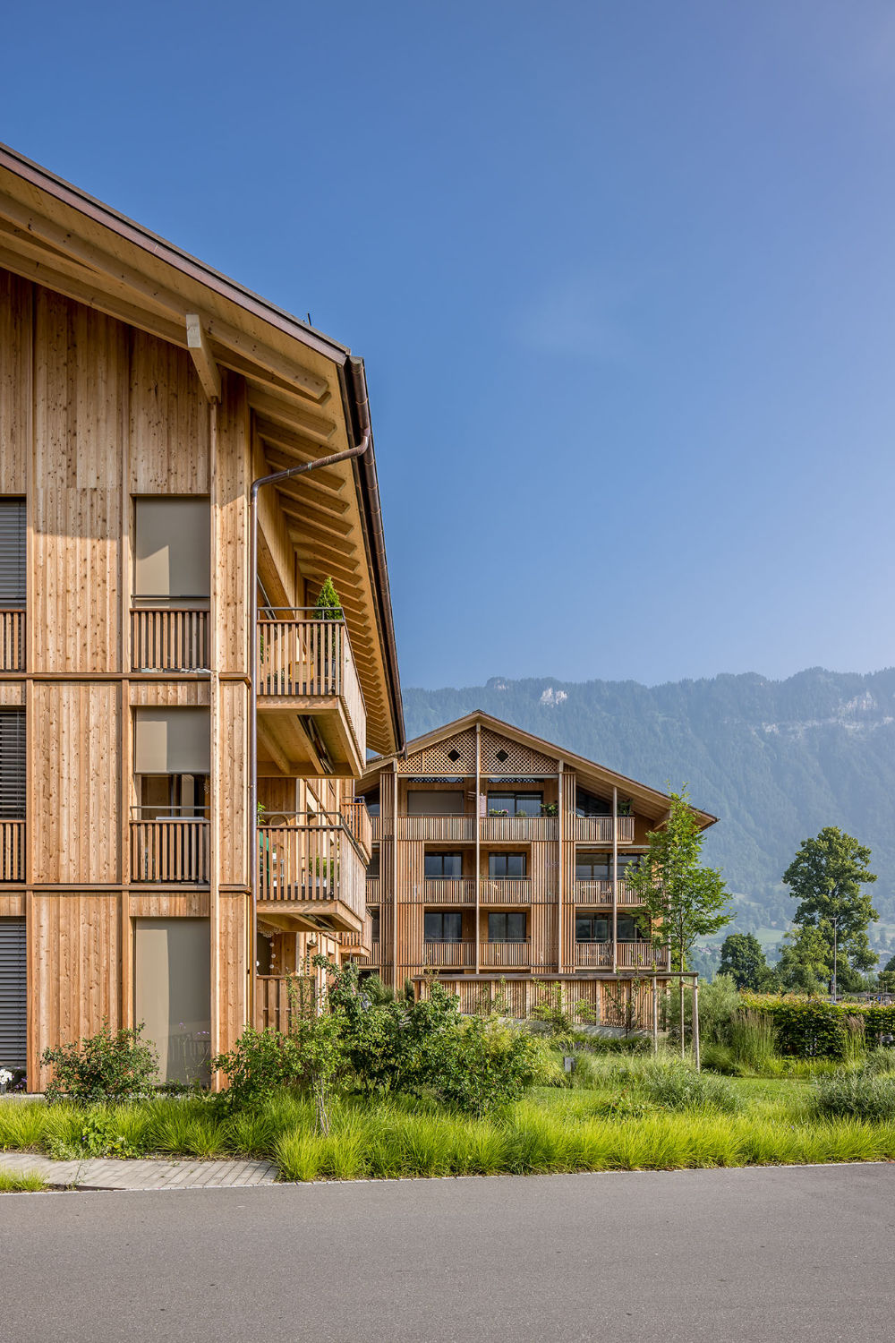 Sieben Mehrfamilienhäuser mit drei Vollgeschossen und einem Dachgeschoss bilden das Ensemble. Durch ihre versetzte Anordnung entstehen interessante Durchblicke und eine offene, lichtdurchflutete Siedlungsstruktur. Dank der zentralen Lage sind Kindergarten, Schule, Einkaufsmöglichkeiten und das Ufer des Brienzersees bequem erreichbar.